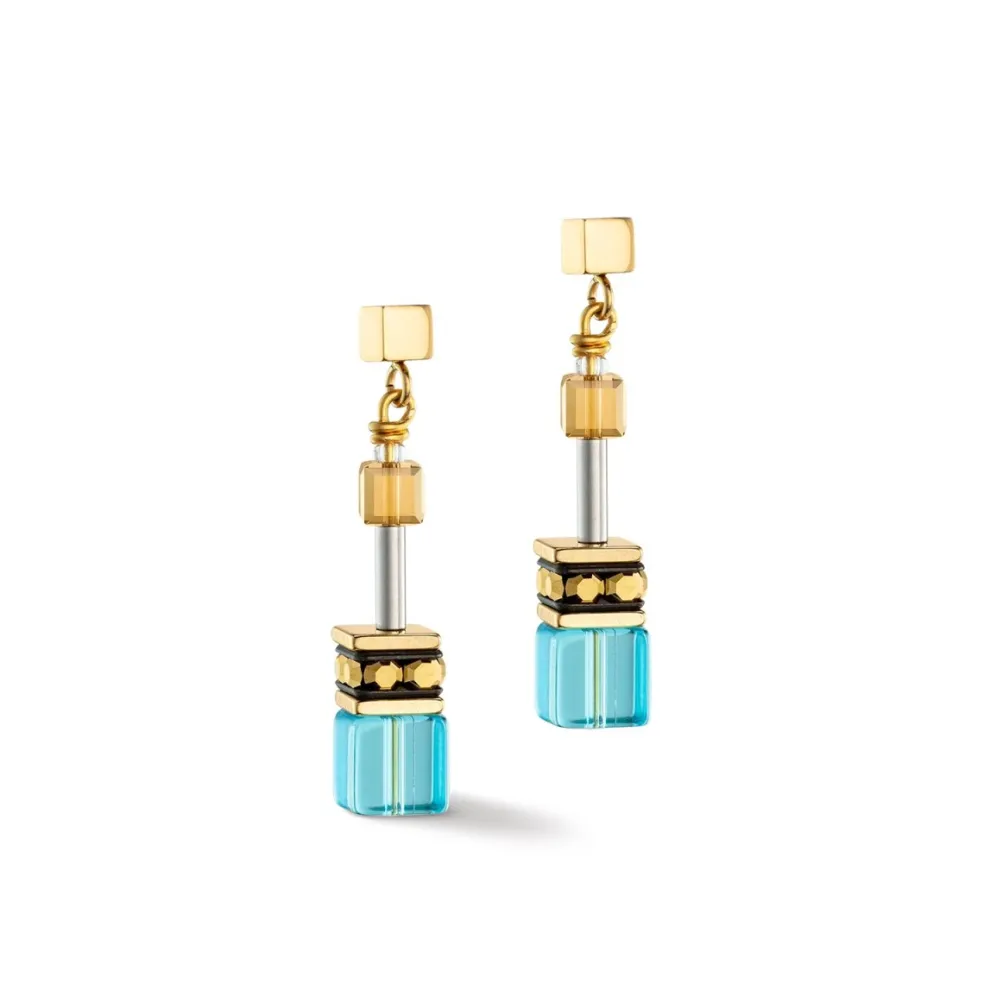 Modell; GeoCUBE® Iconic Earring Gold Turquoise.