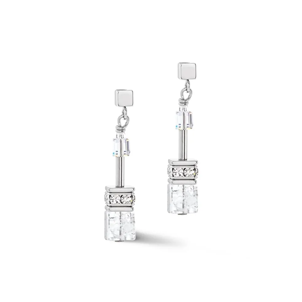 Förhöj din stil med dessa örhängen i silver och vitt från varumärket Coeur de Lion. Örhängena kombinerar den svala glansen av rostfritt stål med klara kristaller och unika spruckna bergkristaller i kubform. Perfekta för alla tillfällen!
