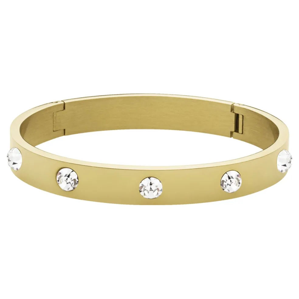 Öppningsbar armring i guldplätering med klara kristaller på, modellen heter Bella och kommer från varumärket Dyrberg/Kern.