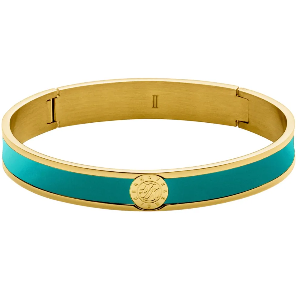 Upplev en smyckesdesign som förenar elegans med funktionalitet med den öppningsbara armringen Pennika från varumärket Dyrberg/Kern. Tillverkad av guldfärgat stål och smyckad med en härlig emalj i den fräscha blå tonen aqua, är detta armband en perfekt blandning av stil och mångsidighet.