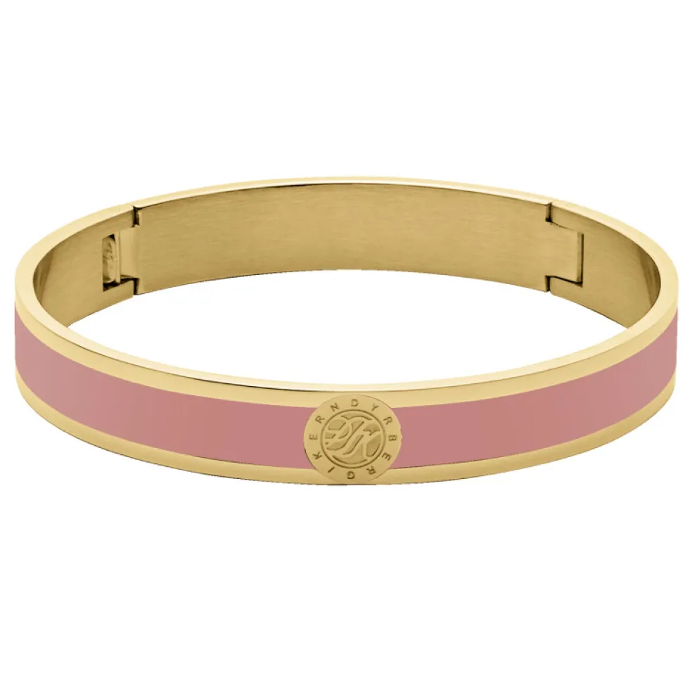 Öppningsbar armring i guldfärgat stål med ljusrosa emalj. Armbandet kommer från Dyrberg/Kerns serien Pennika.