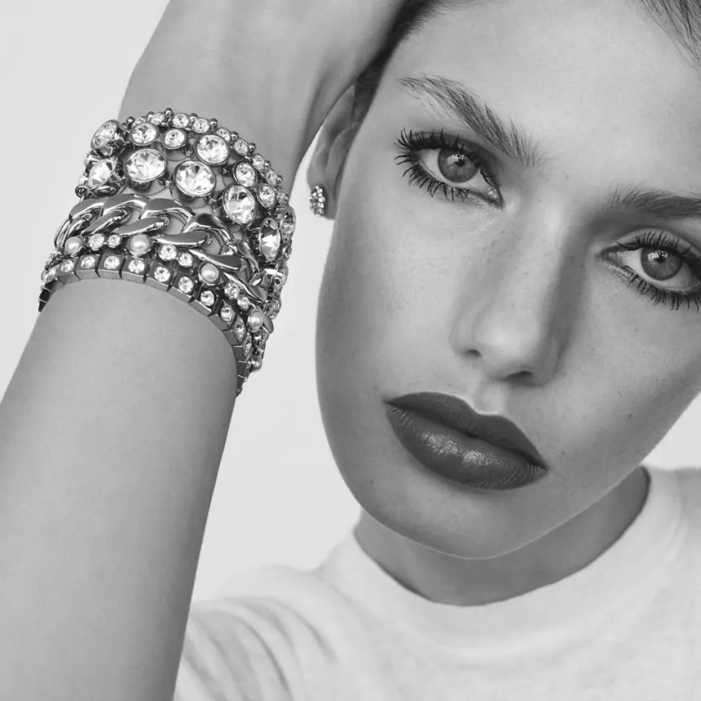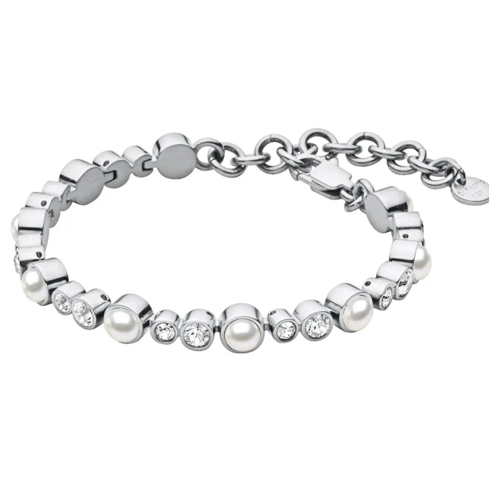 Armbandet är tillverkat i högkvalitativt rostfritt stål som ger det en lyxig och hållbar finish. Stålfärgen utgör en perfekt kontrast till de vita pärlorna och de klara kristallerna. Denna kombination av material och toner skapar en slående effekt som känns både modern och klassisk på samma gång.