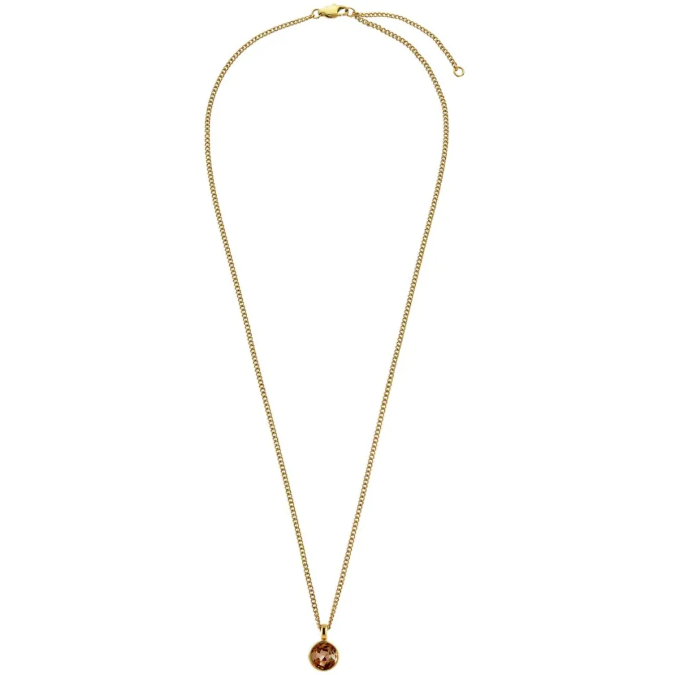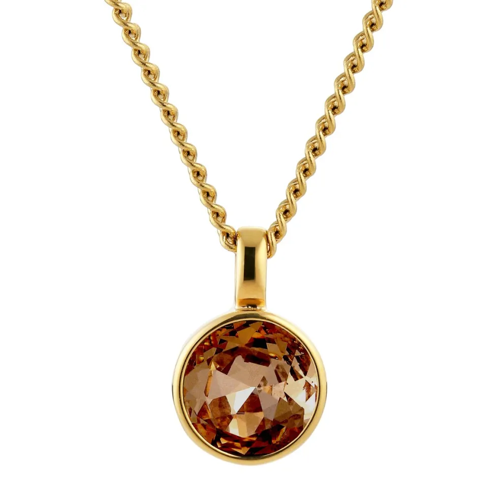 Halsbandet kännetecknas av en stor kristall som hänger som en dekorativ detalj i den guldpläterade kedjan. Kristallen, som mäter cirka 1 cm i diameter är noggrant utvald för sin förmåga att fånga och reflektera ljus på ett magiskt sätt. Den vackra bruna nyansen ger en varm och jordnära ton som kompletterar guldpläteringen perfekt, och skapar en harmonisk och lyxig helhet.
