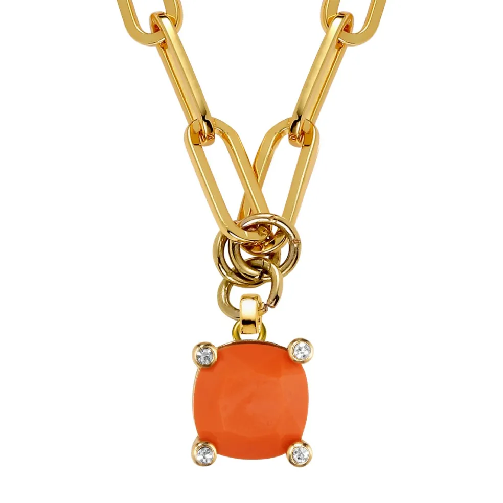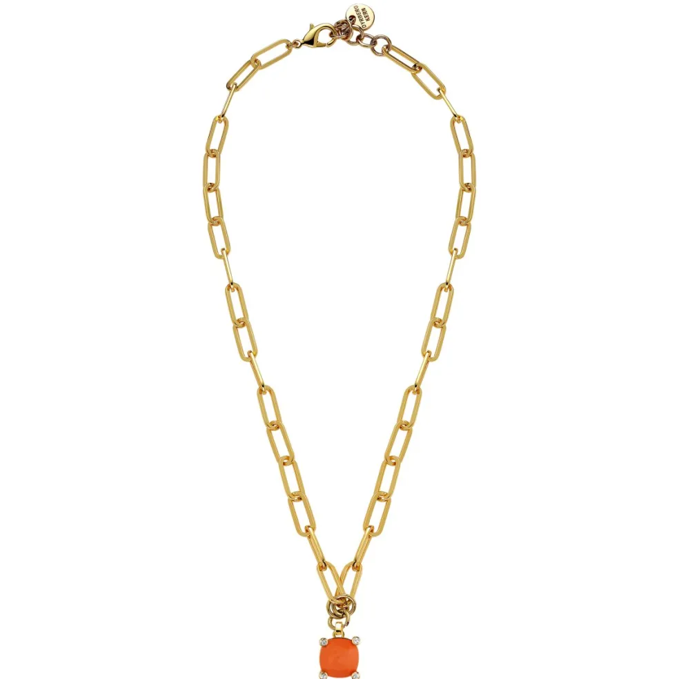 Ramina är ett halsband som kombinerar kraft och elegans på ett perfekt sätt. Med sin något kraftigare kedja ger det en robust och trendig känsla, samtidigt som det ramas in av en vacker sten i färgen coral – en varm nyans med toner av nästan orange.