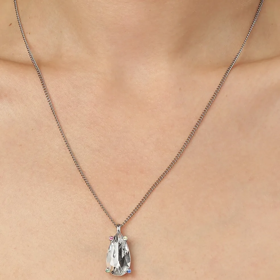 Halsbandet Rockstar är en vacker halskedja, som har ett hänge med en stor droppform, fasetterad klar kristall underbart satt med fyra mindre pastellfärgade kristaller i olika färger. Ett extravagant blickfång, men ändå ganska klassiskt.
