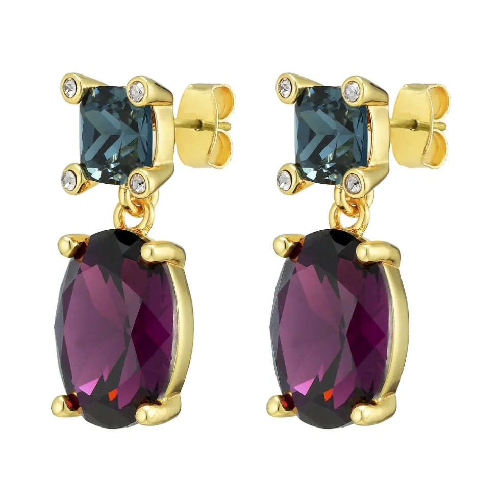 Ännu ett örhänge från Dyrberg/Kern med gnistrande kristaller på, här ser Ni modellen Antonia med gröna och lila kristaller.