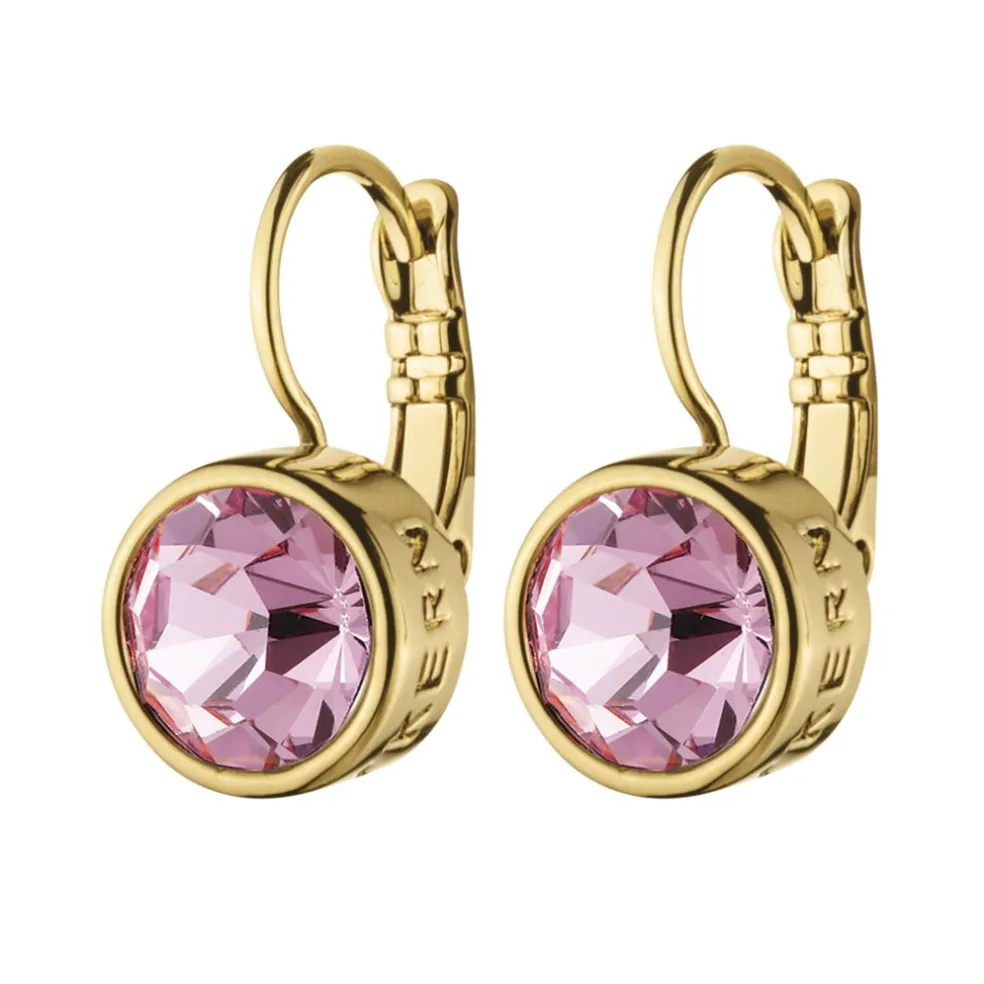 Dyrberg/Kerns ikoniska och bästsäljande örhänge med guldfinish och en ljusrosa solitär kristall i bästa kvalité. Här kombineras en elegant look med klassisk skandinavisk stil på bästa sätt.