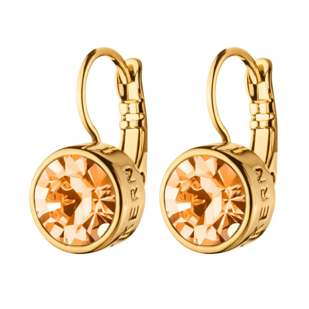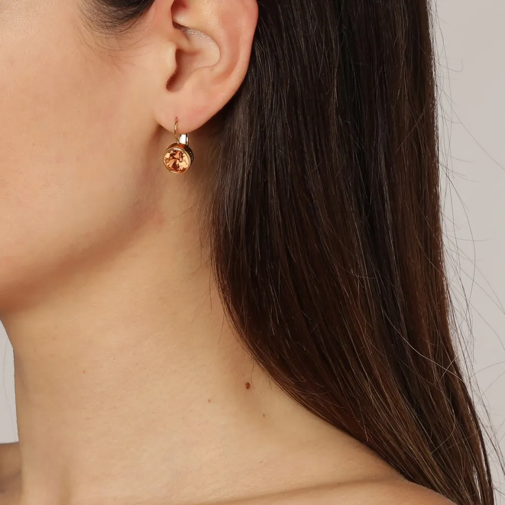 Örhängena är 2 cm långa inklusive krok och pryds av en gnistrande kristall som mäter 1 cm i diameter. Kristallens mjuka peachfärg ger örhängena en lyxig men ändå diskret framtoning.