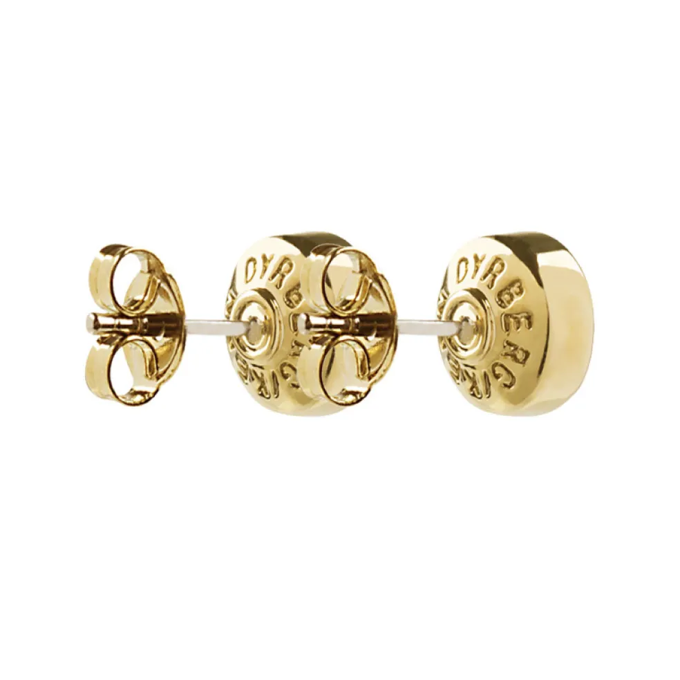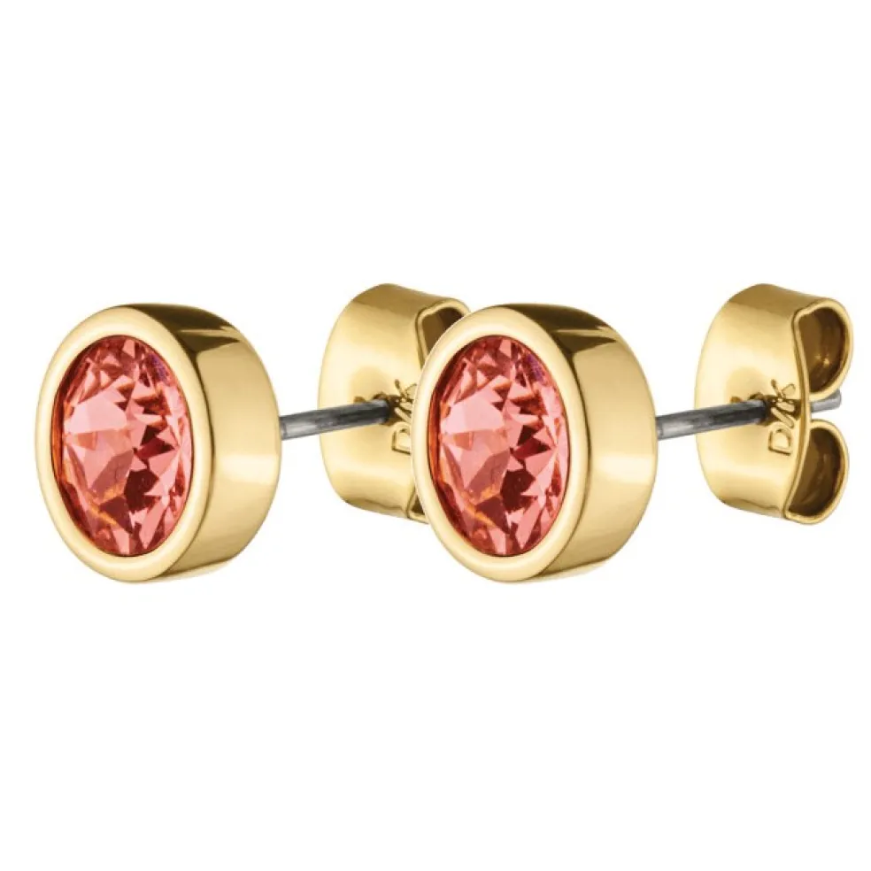 Noble är ett par små och eleganta örhängen på stift från varumärket Dyrberg/Kern, här i guldpläterad metall med korallfärgade kristaller.