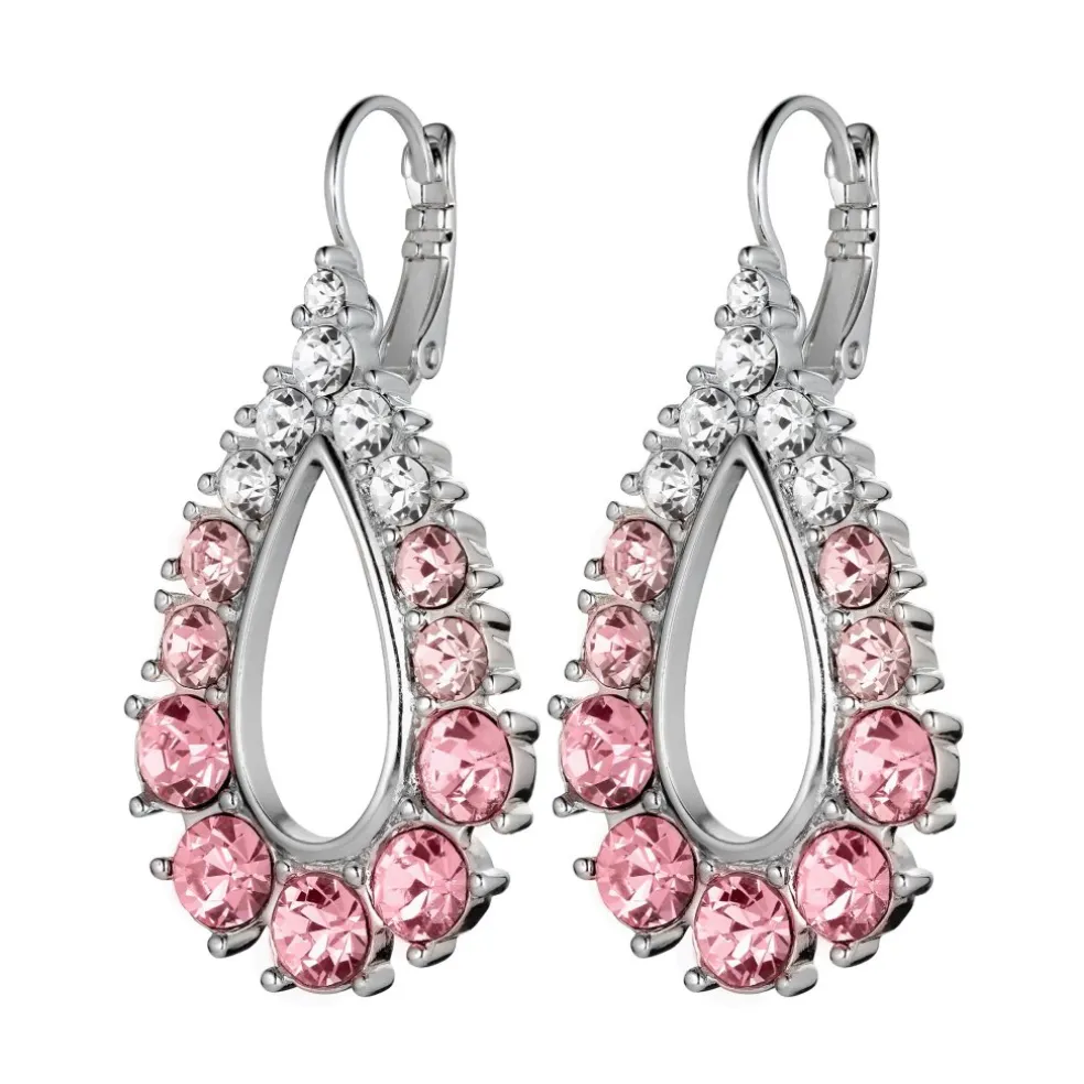 Droppformade örhängen på krok med massor av gnistrande kristaller, här i silverfärg med ljusrosa, persikofärgade och klara kristaller.