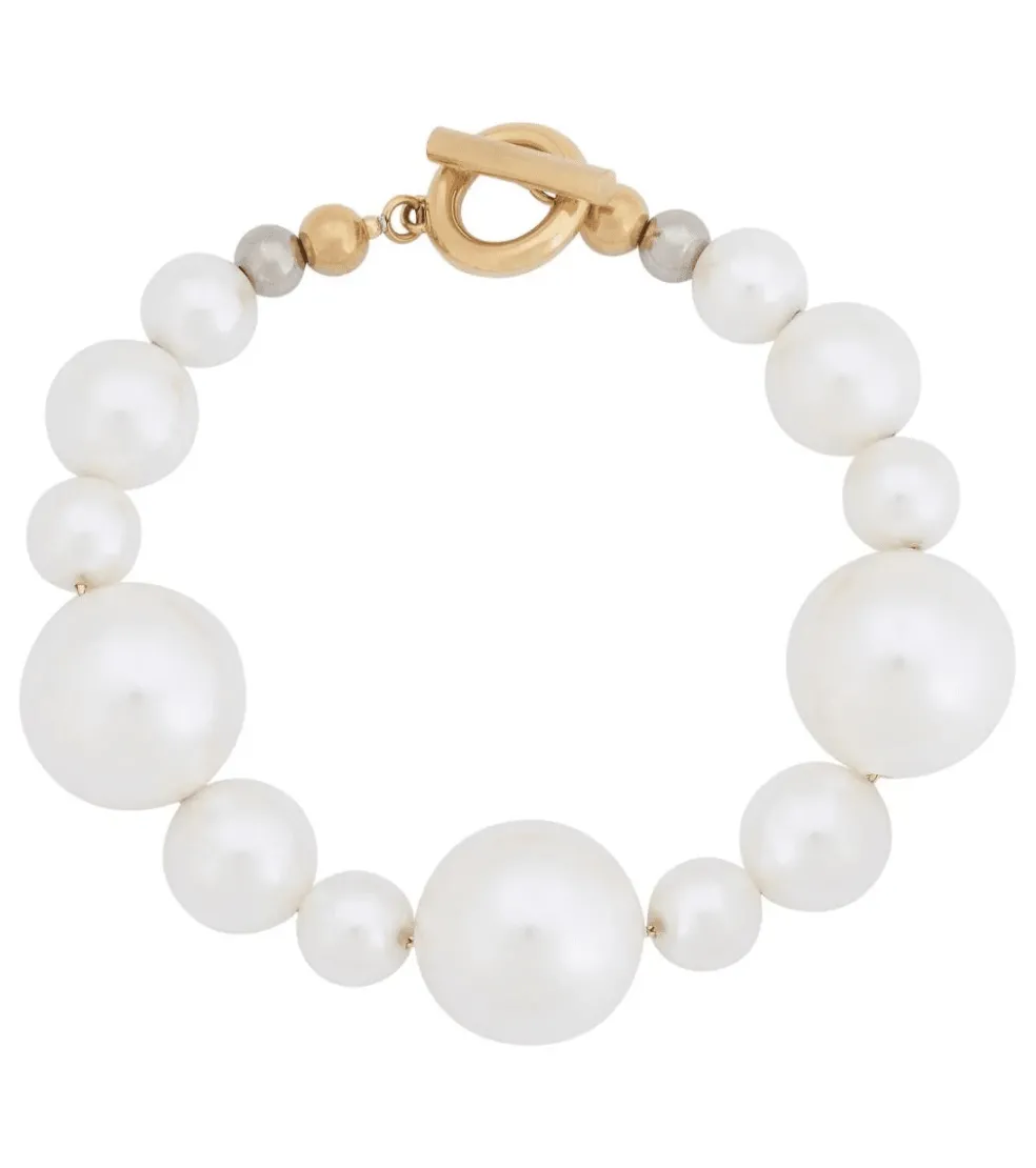 Här har Edblads designteam lekt med proportioner och maximalistiska stora klotrunda pärlor med härlig tyngd och glans som avslutas med pärlor i stål och guldfärg. Armbandet har pärlomorpärlor och låset med förlängningskedja är tillverkat i blank 14K guldplätering.