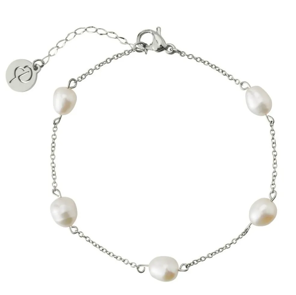I Perla multiarmband är fem vackra sötvattenpärlor länkade med en fin kedja i blankt rostfritt stål.