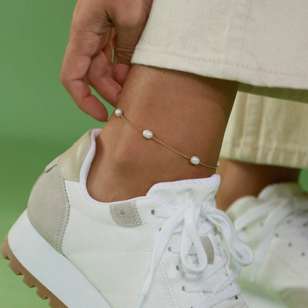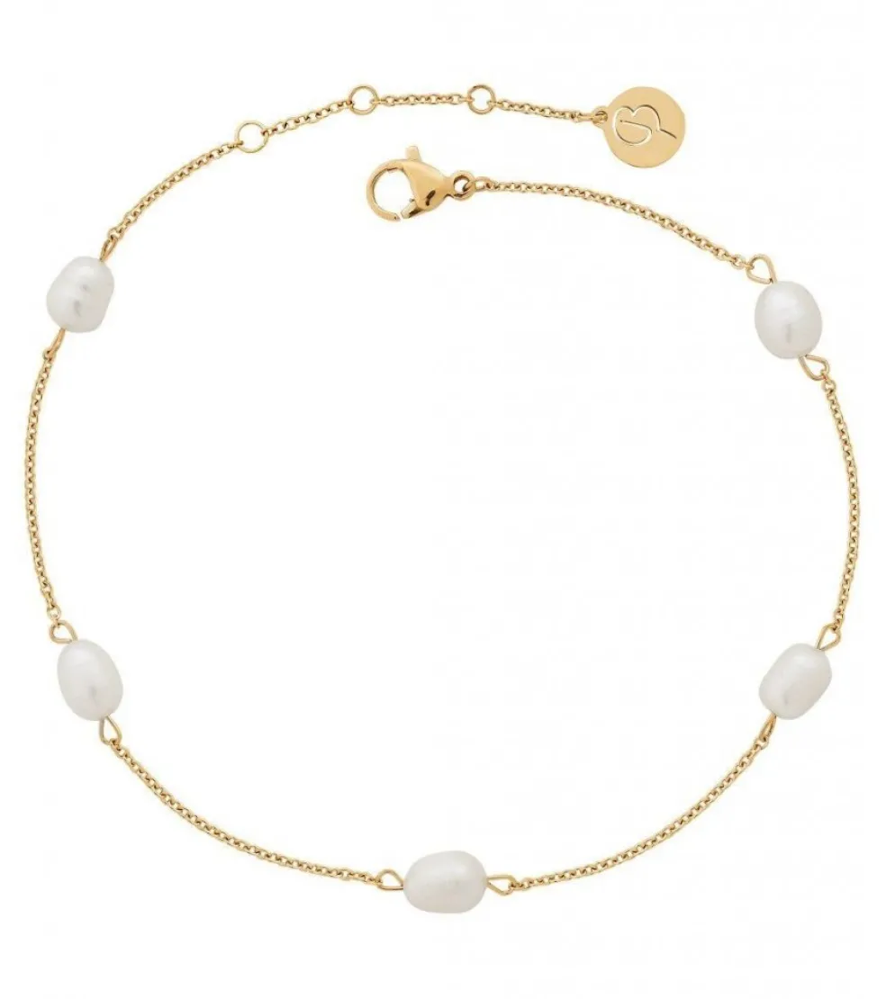 I Perla fotlänk är fem vackra sötvattenpärlor länkade med en fin ankarkedja i 14 karats guldpläterat stål.