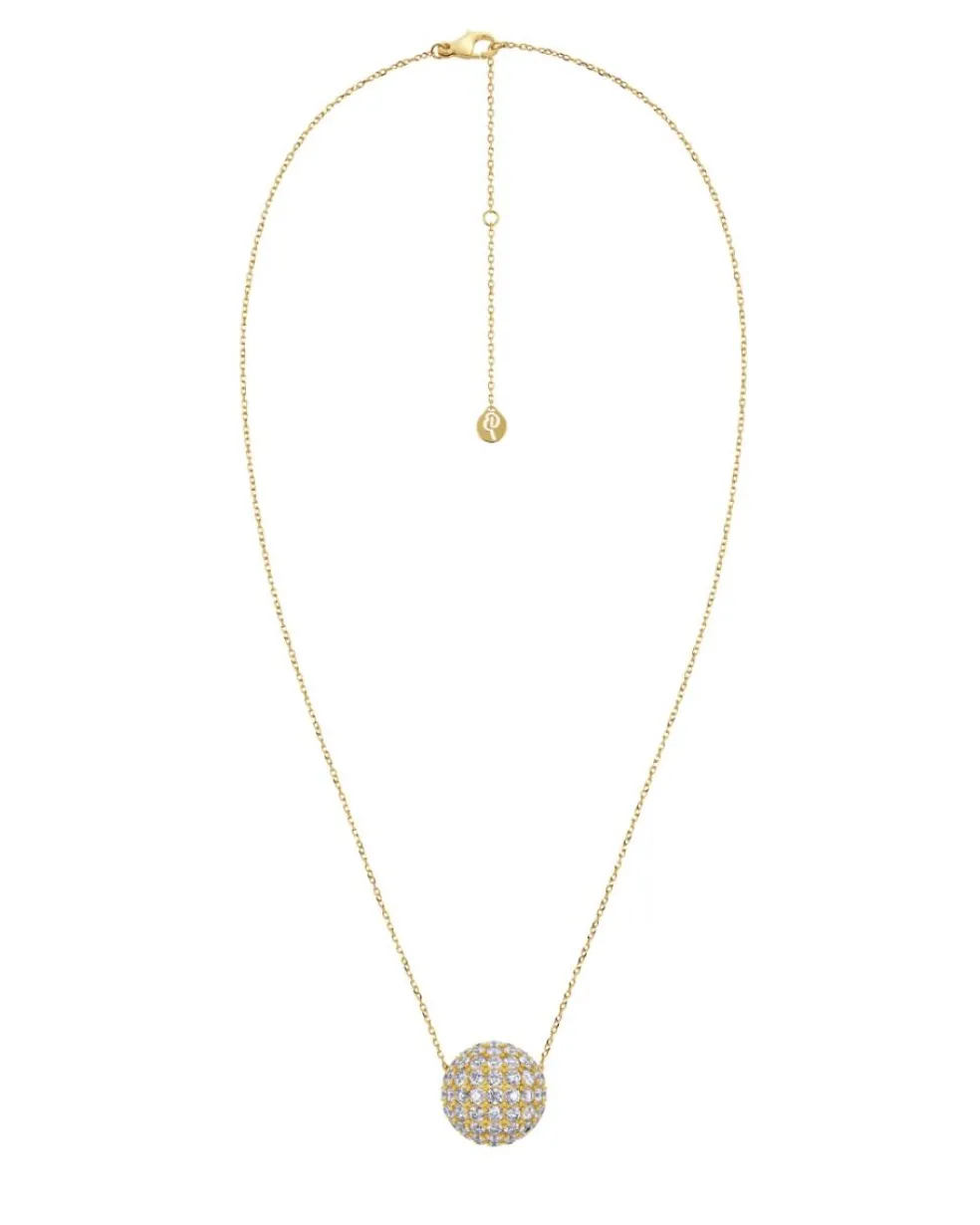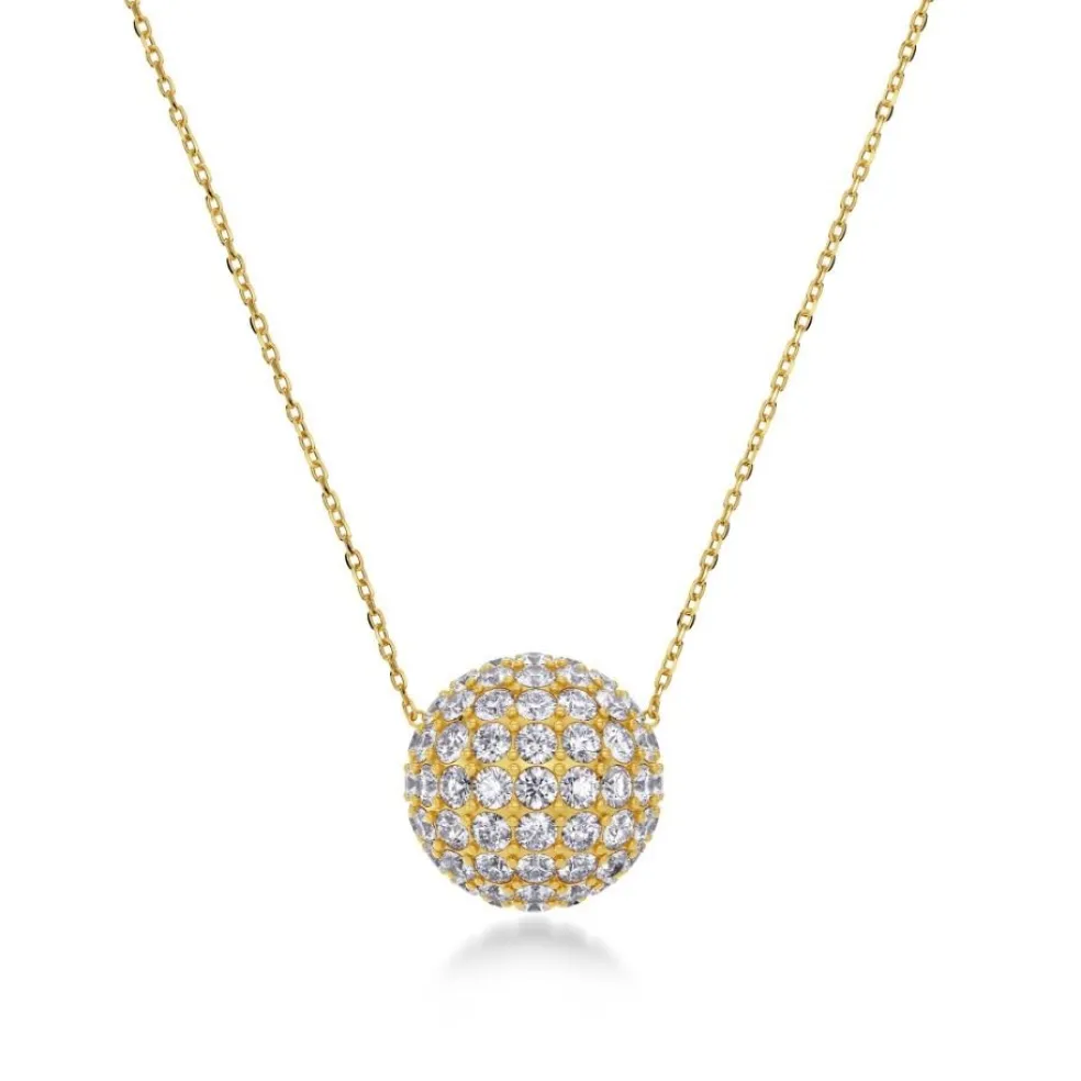 Detta halsband är smyckat med en gnistrande boll med klara stenar och fasetterade ankarkedja. Kedjan löper elegant genom den gnistrande kulan. Den blanka 14K guldpläteringen ger en lyxig touch som drar blickarna till sig.