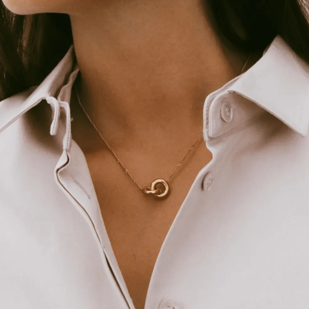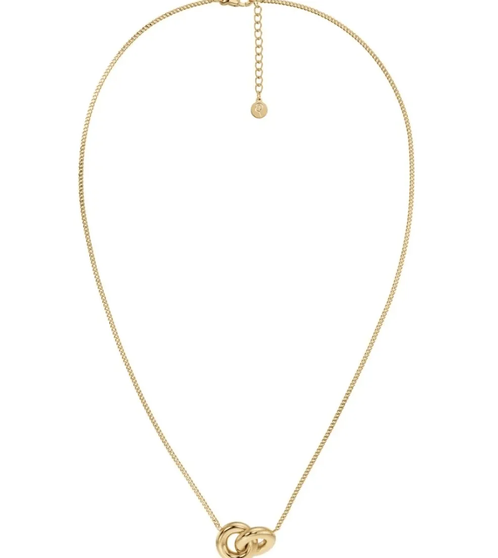 De dubbla ringarna sitter på en pansarlänk vilket ger ett elegant intryck, här i 14K guldplätering.