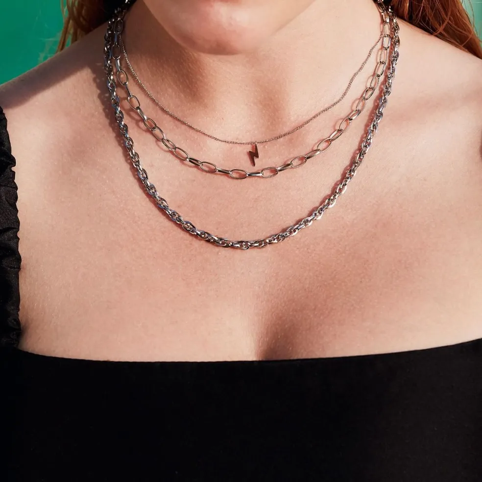 Edblads klassiska serie Lightning där blixten är en retrosymbolen. Blixten symboliserar vilja, attityd och spänning. I Lightning halsbandet hänger blixten i en tunn pansarkedja som här ses i blankt rostfritt stål.