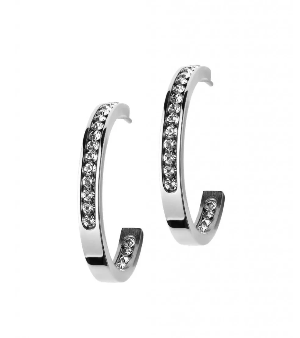 Andorra örhänge Small är med sina gnistrande stenar på halva utsidan och halva insidan diskret men ändå festlig. Andorra Small är fina att bära till alla tillfälle, ses här i rostfritt stål.