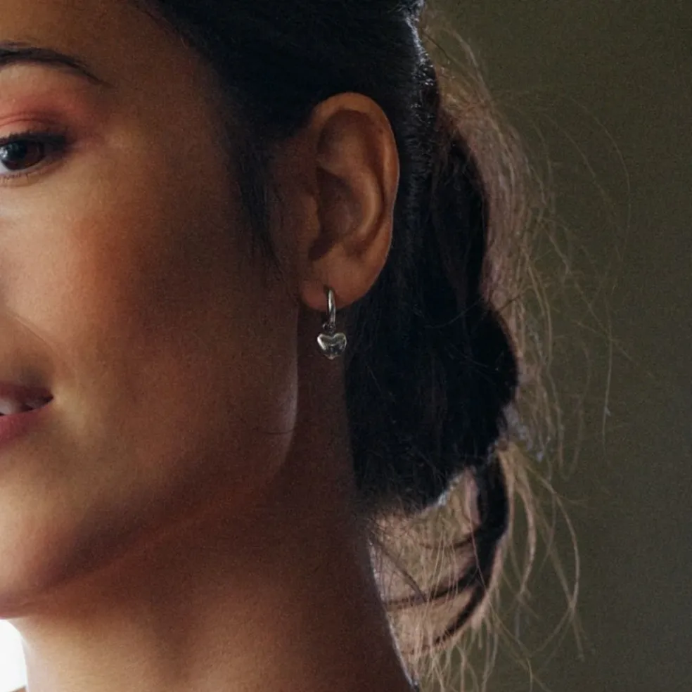 Dessa hoops örhängen är utformade med en liten, fyllig hjärtformad detalj som hänger ned från ringen, vilket ger dem en romantisk touch. Det blankpolerade rostfria stålet ger ett stilrent och modern uttryck, medan den hjärtformade pendeln tillför en subtil men ändå märkbar glans.