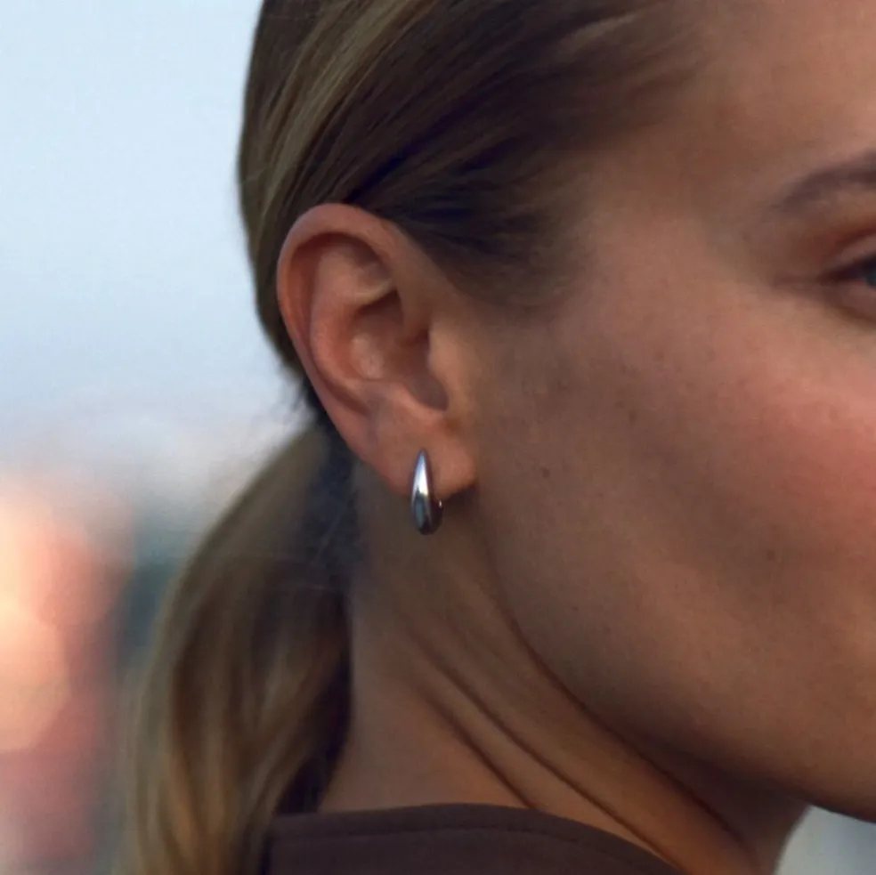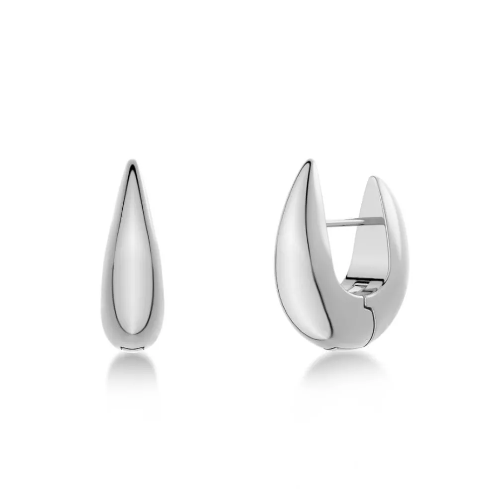 Örhängena Crest Hoops från varumärket Edblad är snyggt designade med sitt spetsiga avslut och smala droppform, ses här i blankt stål.