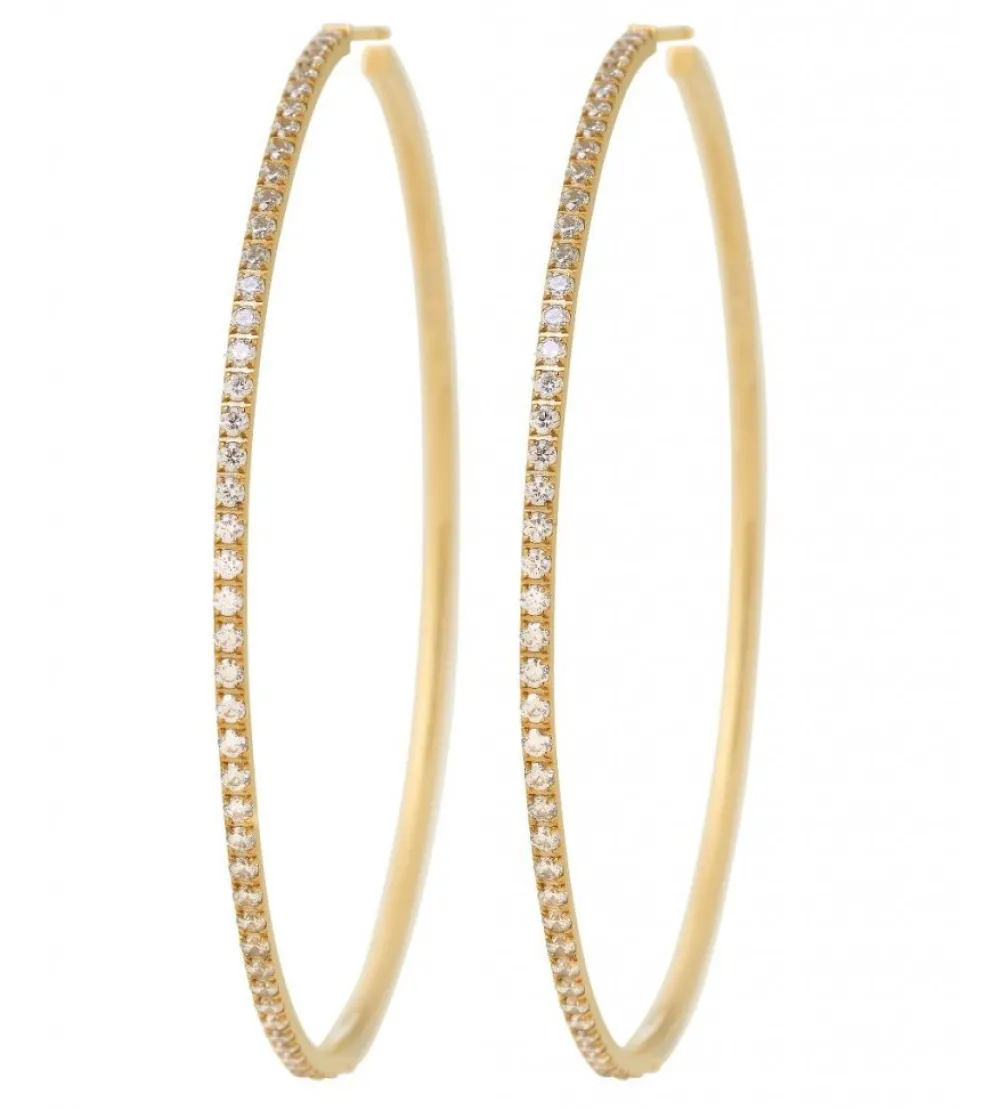 Härliga Glow creoler kommer här i en stor trendig modell som är självklar att bära på alla fester och tillställningar. Glow creloer mini är elegant tunna och storleken XL har klara stenar satta på halva örhängets utsida, metall i 14 karats guldpläterat stål.
