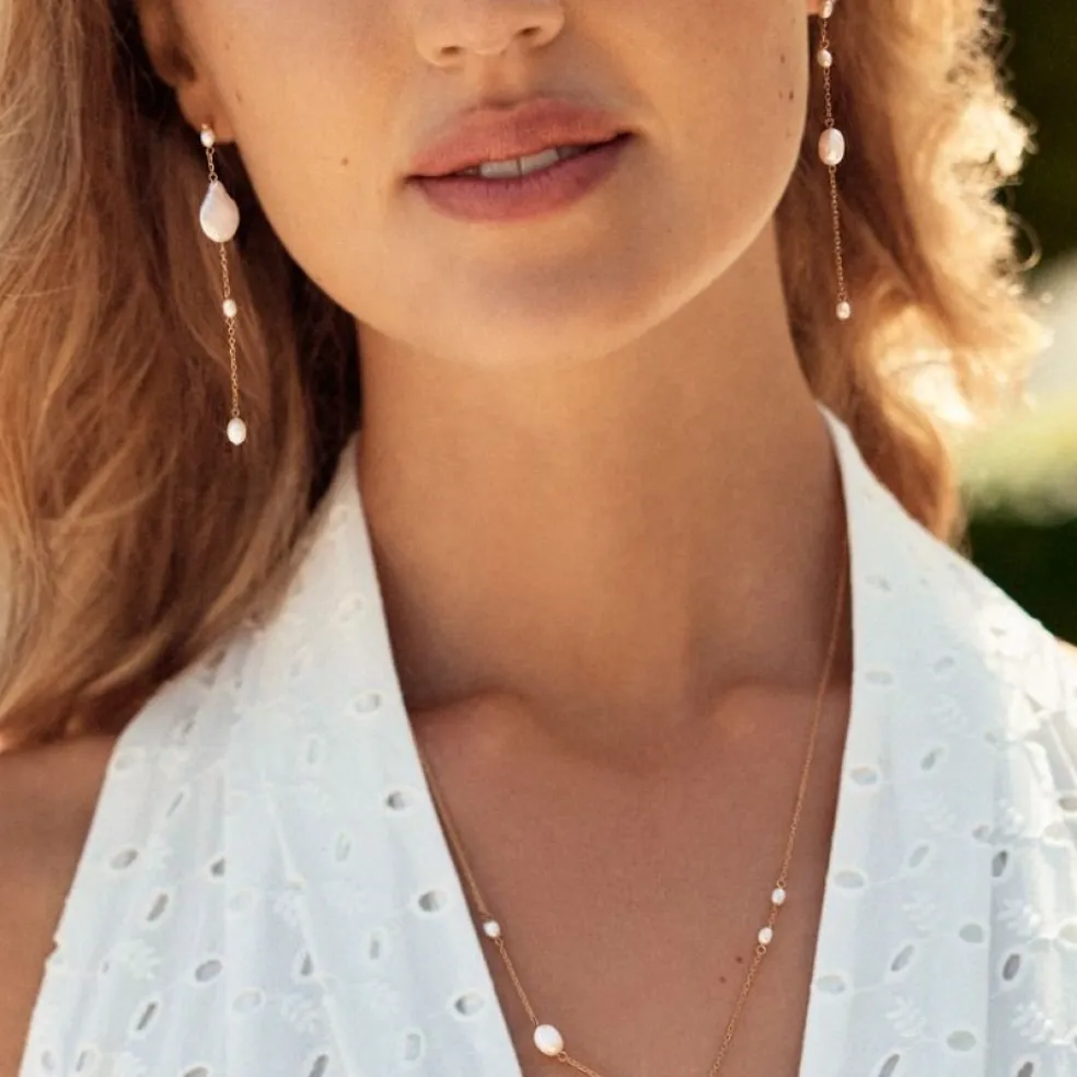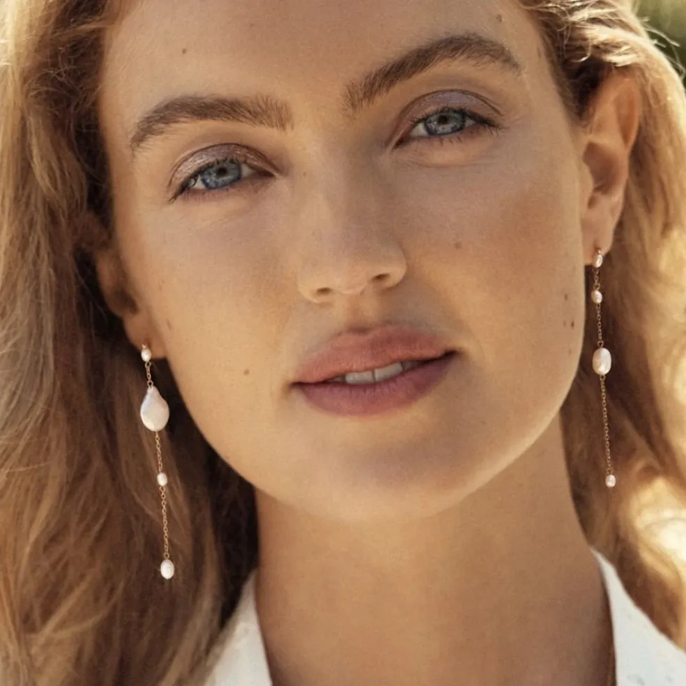 Dyk in i Ocean seriens förtrollande värld med dessa bedårande pärlörhängen, som mäter hela 7,7 cm i längd. De utstrålar en känsla av lätthet och flärd med sina ojämna sötvattenpärlor och lekfulla asymmetri.