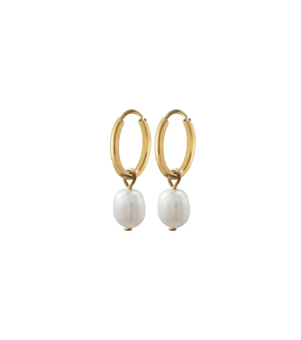 Perla är en serie med fina sötvattenpärlor som med sin naturliga form ger spänning och elegans, samt att varje smycke i sig blir unikt. Perla creoler har en liten sötvattenpärla som hänger i ringen som här är i blankt 14 karat guldpläterat rostfritt stål.