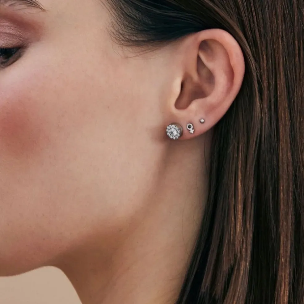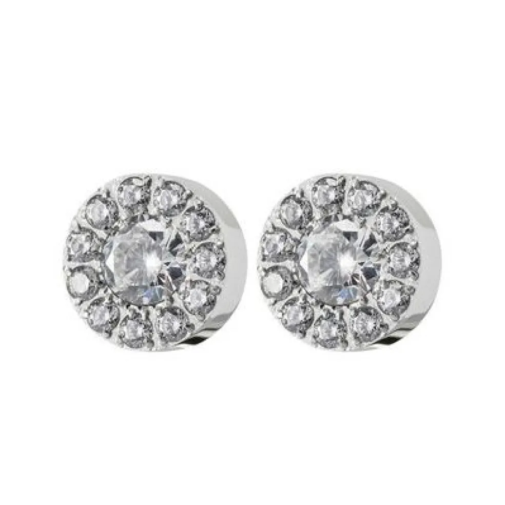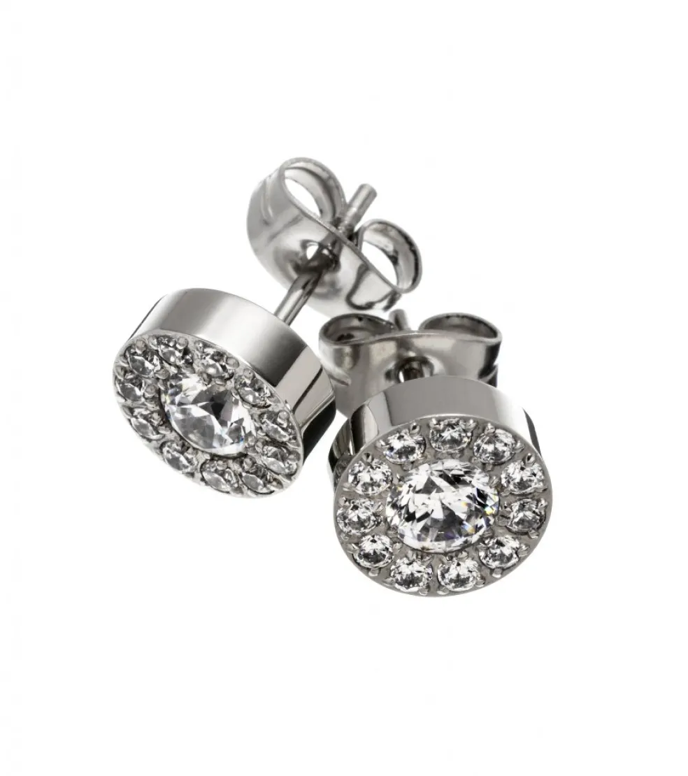 Thassos stiftörhänge matchar snyggt de båda halsbanden. Här har det glittrande smycket i stål en stor sten som omges av 11 små stenar.