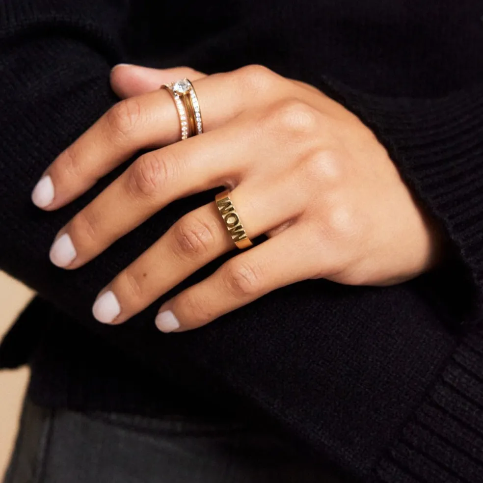 Signet ring MOM eller WOW, välj själv hur du vill läsa och tolka budskapet i ringen. MOM ringen är en smala klackring som är en fin present till mamma.