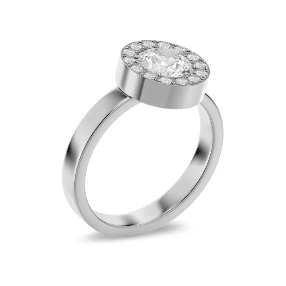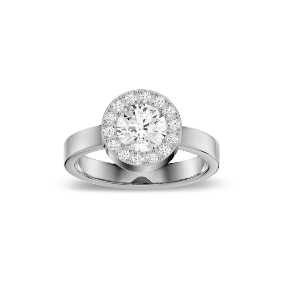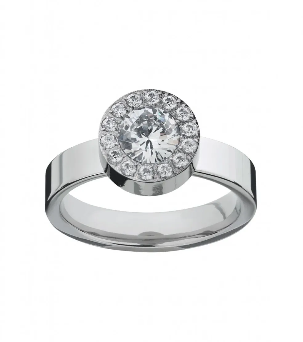 Ring Thassos här i blankt stål har en stor klassisk rund sten som här är omgiven av 14 små stenar. Skenan är Edblads stapelbara och har en lite rundning som gör den mycket skön att bära.