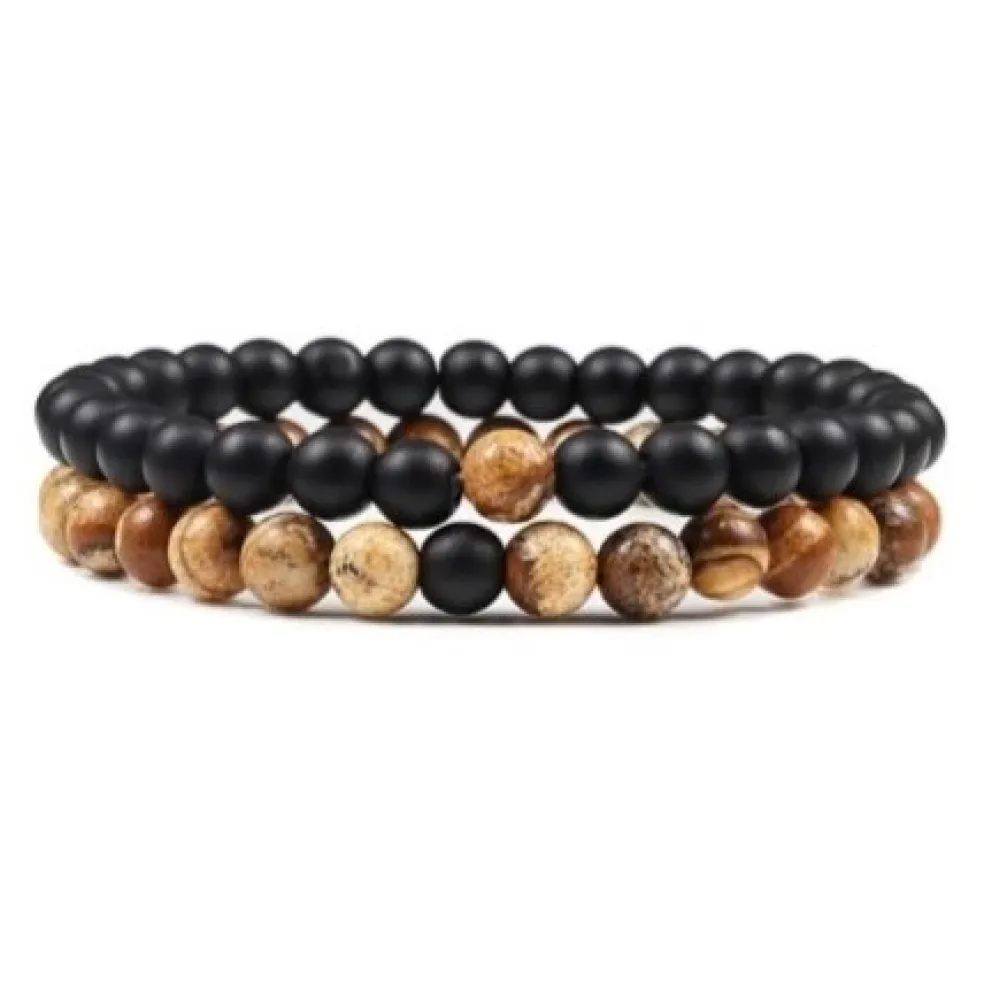 Två elastiska armband med naturliga stenar på, här med ljusbrun jaspis på det ena armbandet och matt svart obsidian på det andra armbandet.