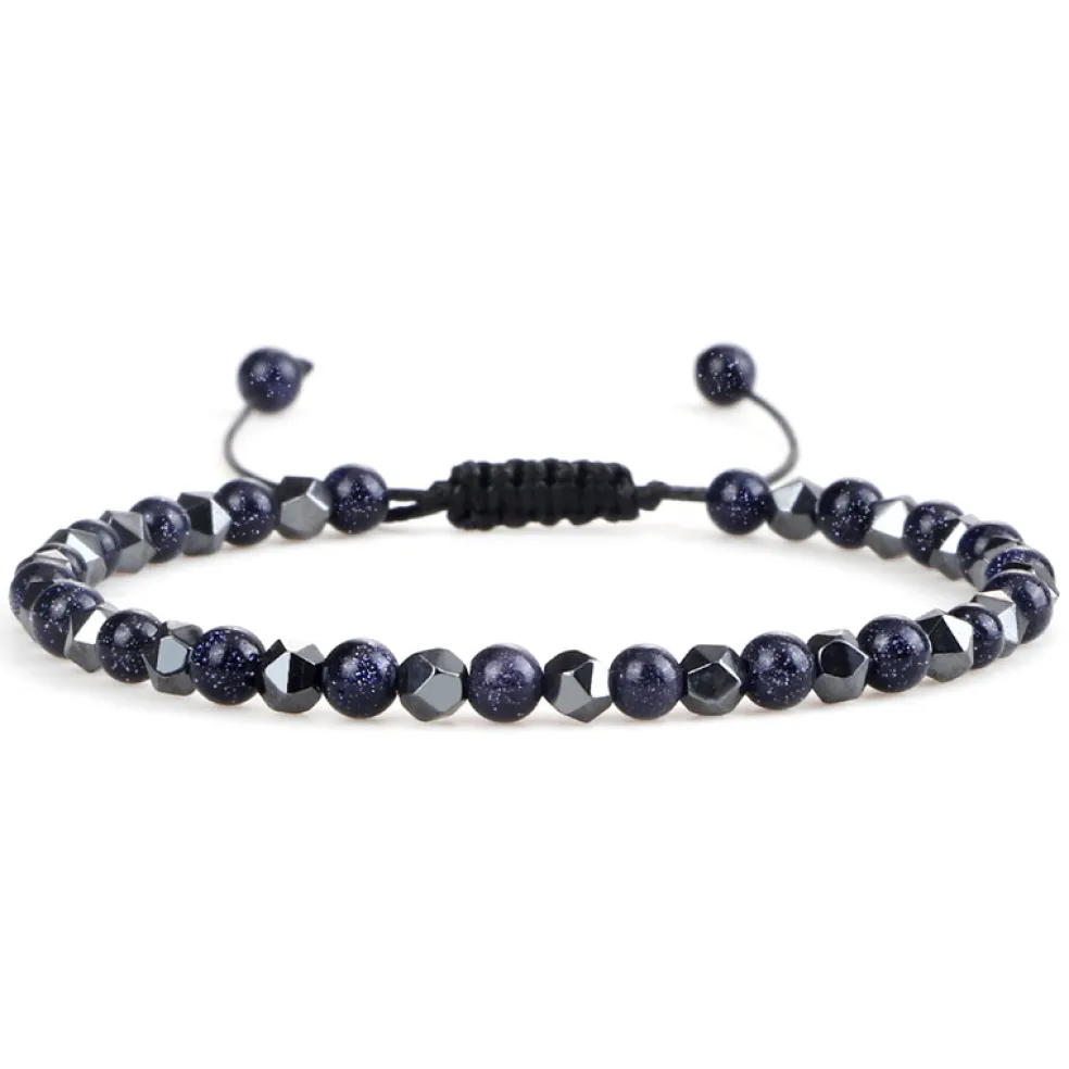 Armband med dragsko tillverkad av kulor i blå sandsten och fasettslipad hematite.