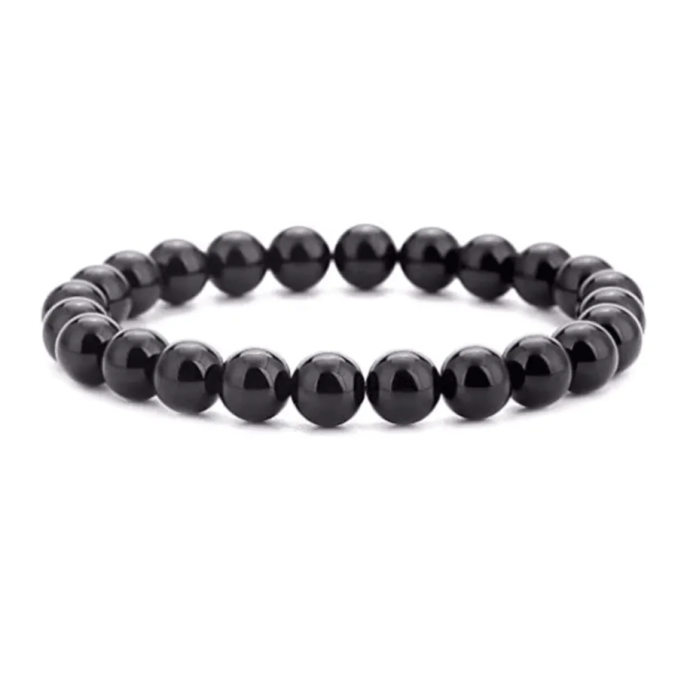 Ge din look en skarp och självsäker edge med Erons elastiska armband, designat med 8 mm stora kulor av blanka svarta stenar. Den glänsande ytan fångar ljuset på ett imponerande sätt och ger ett stilrent, men ändå kraftfullt intryck. Detta armband är det perfekta valet för killen som vill ha något både elegant och rått.