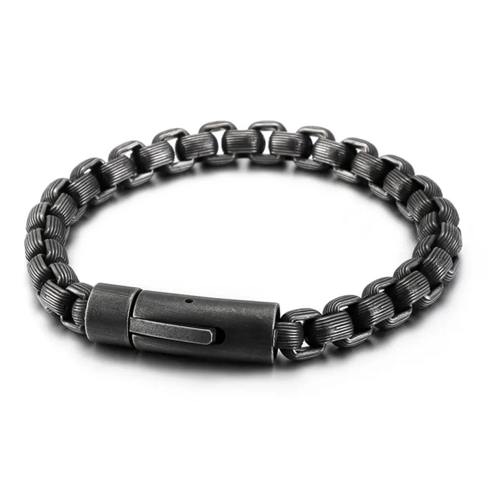 Omtyckt armkedja med klicklås, just denna typ av kedja kallas boxkedja och består av fyrkantiga länkar som är sammansatta på rad. Den här boxkedja har ett tunt linjemönster på länkarna.