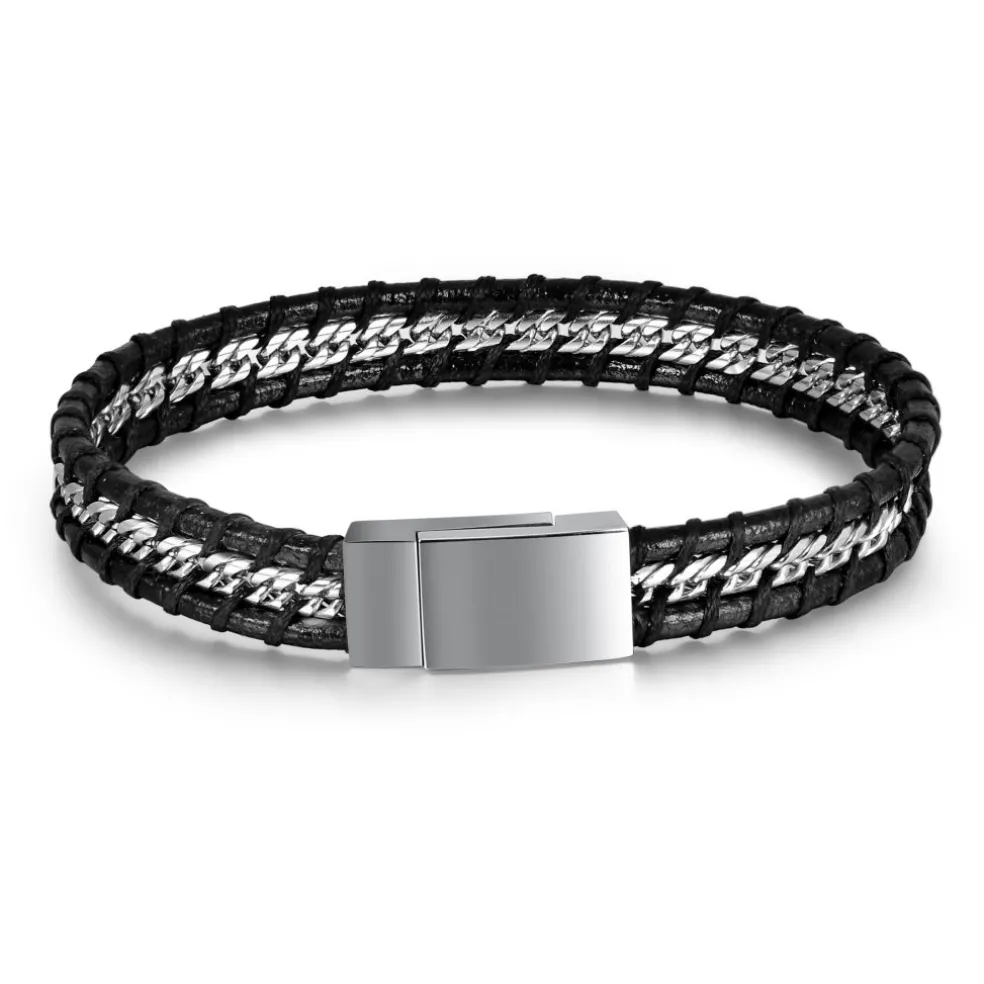 Riktigt snyggt armband i stål med inflätat läder på, modellen kommer från varumärket Eron och finns i flera olika längder.