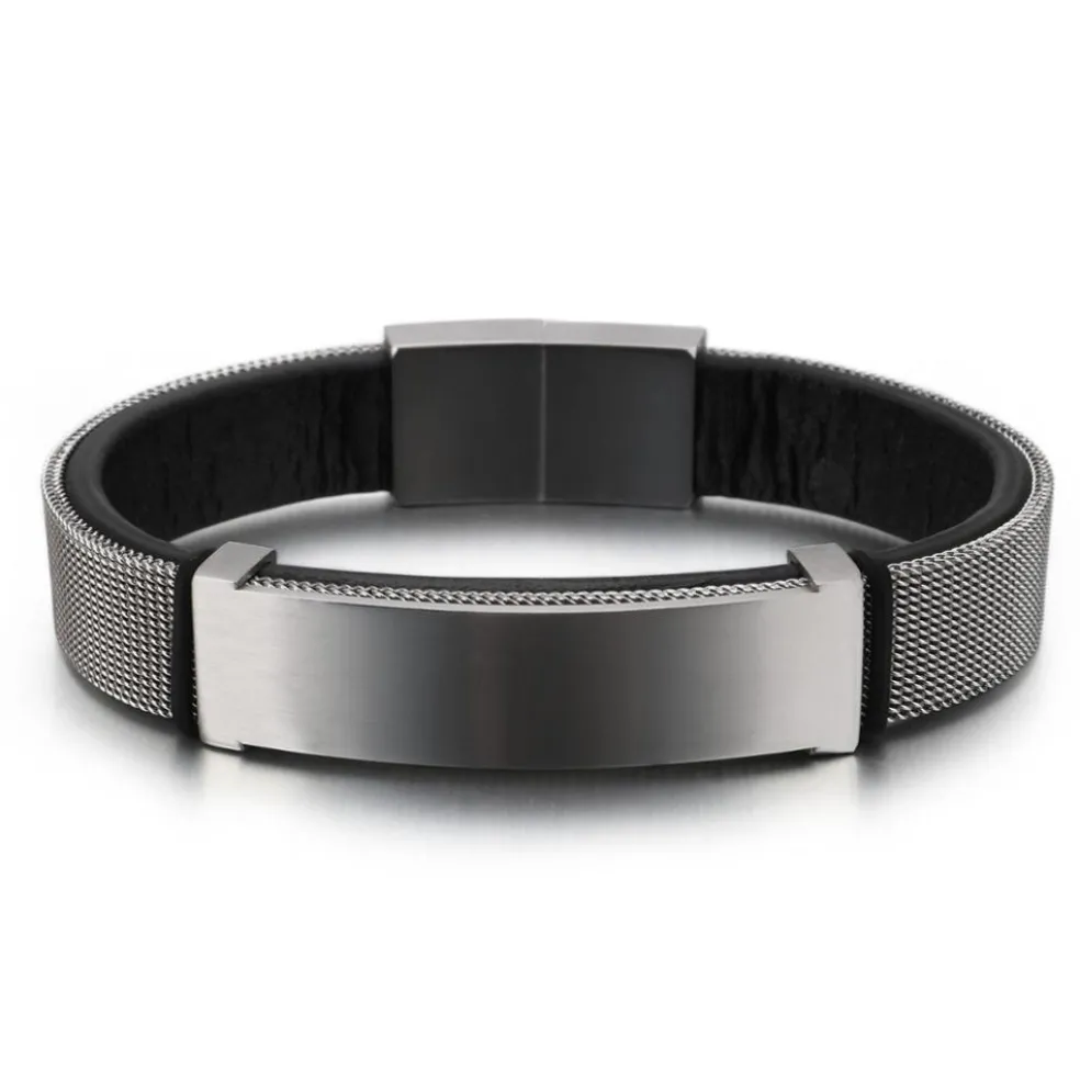 Supersnyggt armband i läder med mechband i stål som avslutas med en elegant platta i blankt stål. Plattan är graverbar och ca 5 cm bred.
