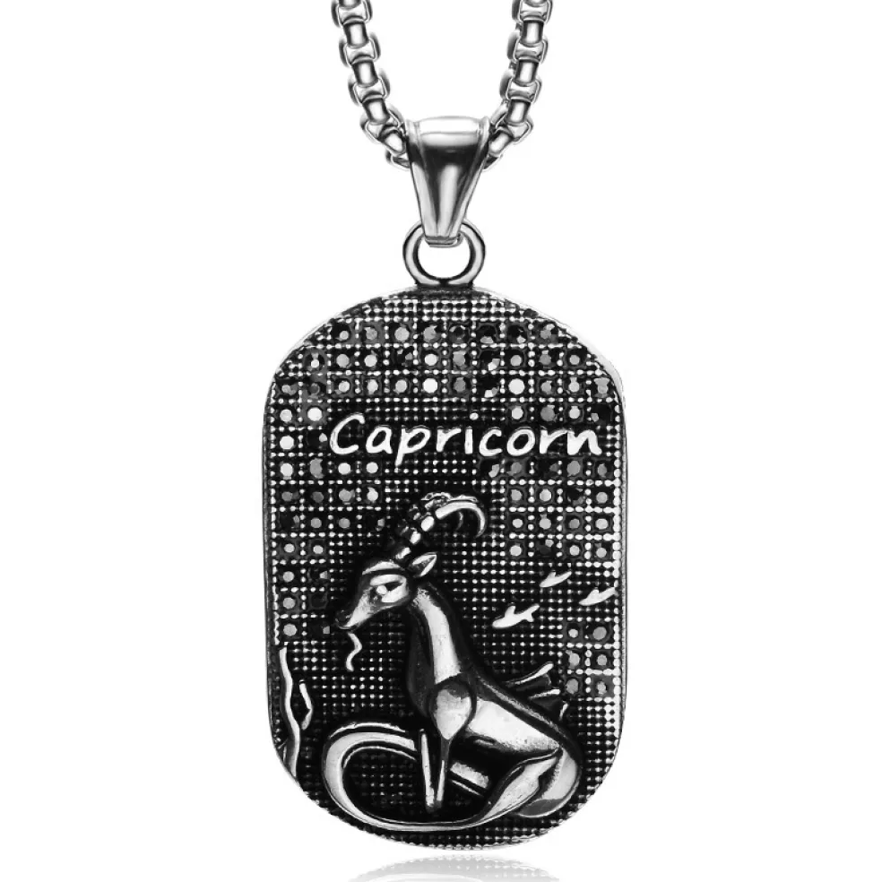 Halsband med stjärntecken STENBOCKEN, här i stål för bästa hållbarhet. På hänget sitter det små svarta kristaller som gnistrar fint i ljuset.