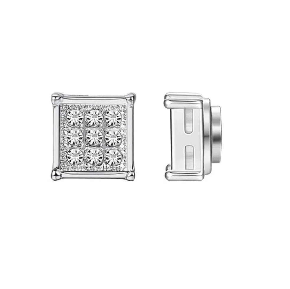 Silverfärgat örhänge med magnet för dig utan hål i öronen, här med nio små gnistrande kristaller på. Örhänget är tillverkat i stål.