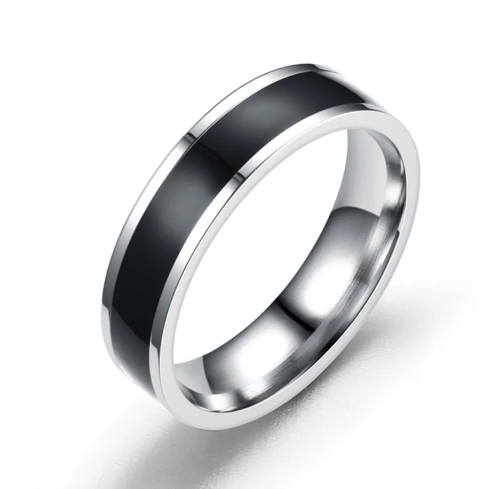 Stålring i två färger, där kanten är silverfärgad och bandet i mitten svart, modellen heter Two och kommer från varumärket Eron.