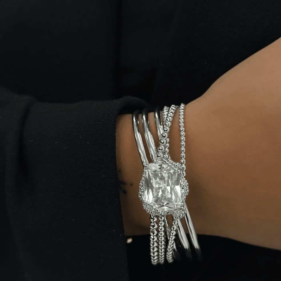Hård silverfärgad armcuff från Ioaku med klar kristall.