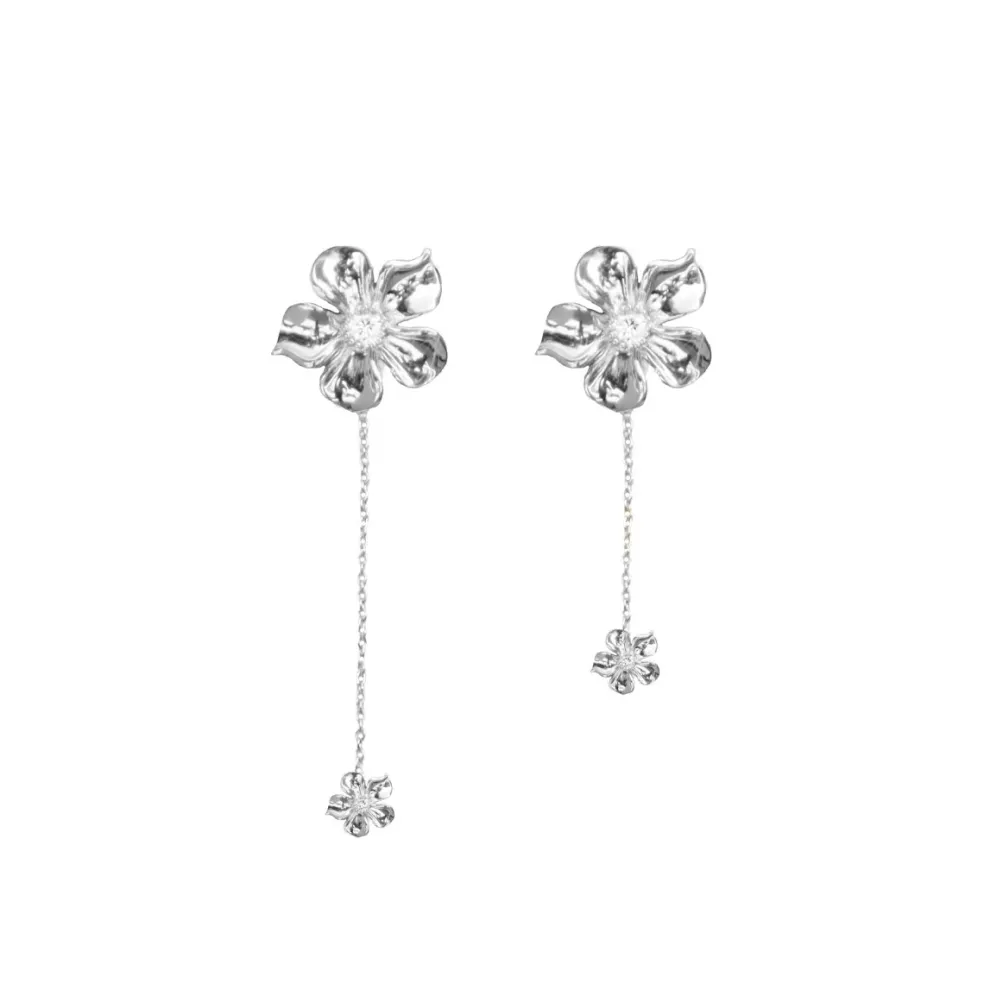 Assymetriska örhängen med hängade blomma. Örhänget är silverpläterat och har klara kristaller.