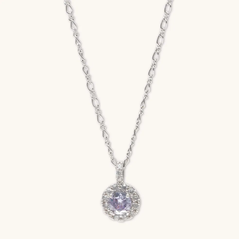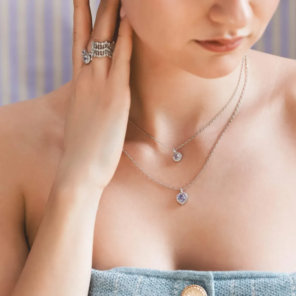 Halsbandets mittpunkt är en fängslande lavendelsten, omgiven av klara stenar som ger en briljant touch. Lyft din stil med den förtrollande charmen av detta unika verk, där den känsliga balansen av färger skapar en harmonisk symfoni av elegans.