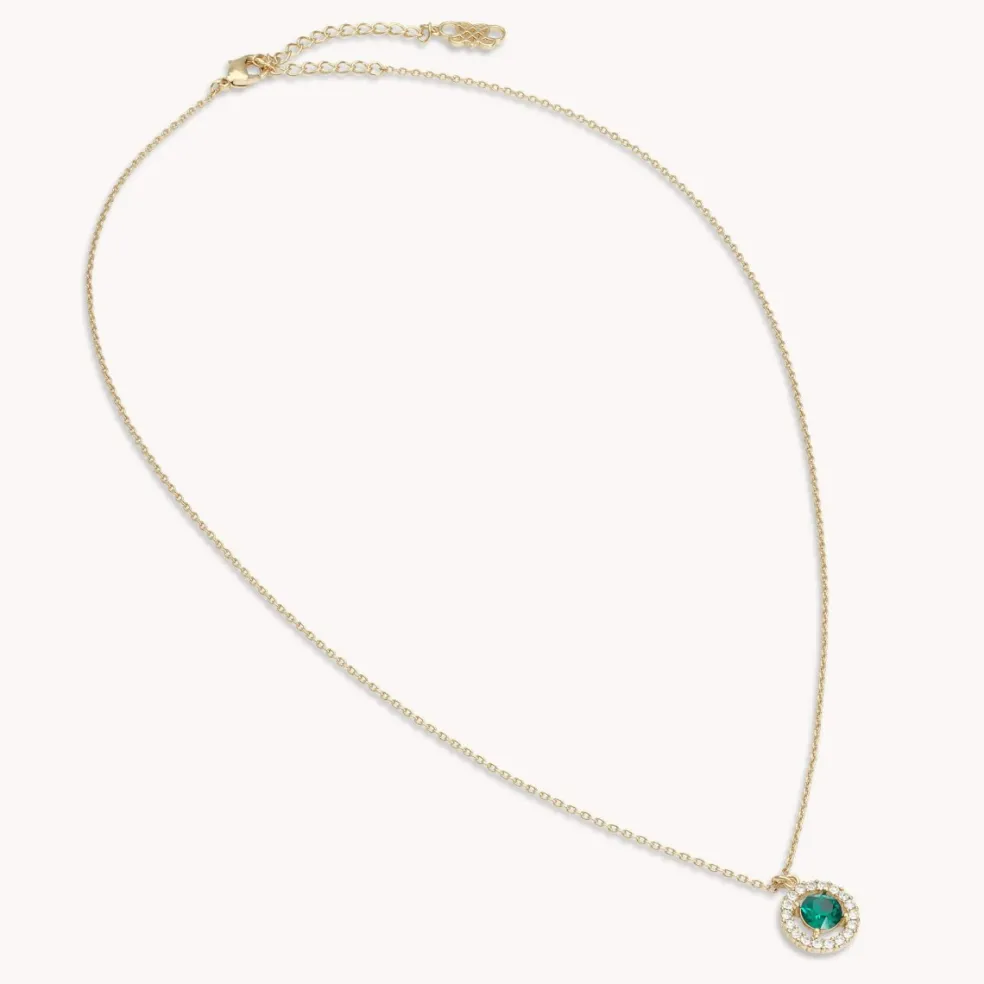 Detta halsband är ett uttryck för klassisk feminin elegans, med en fängslande emeraldgrön kristall som huvudfokus. Kristallen hålls på plats av fyra eleganta "klor" och omges av en cirkel av mindre, gnistrande genomskinliga kristaller, vilket skapar en vacker kontrast mot den djupa gröna tonen.