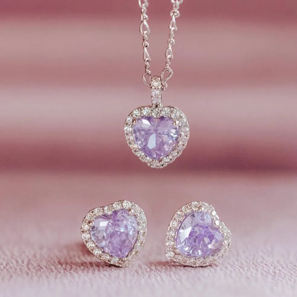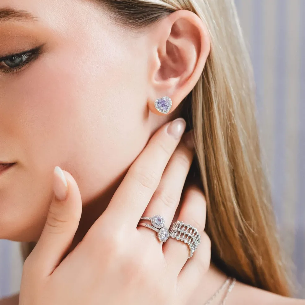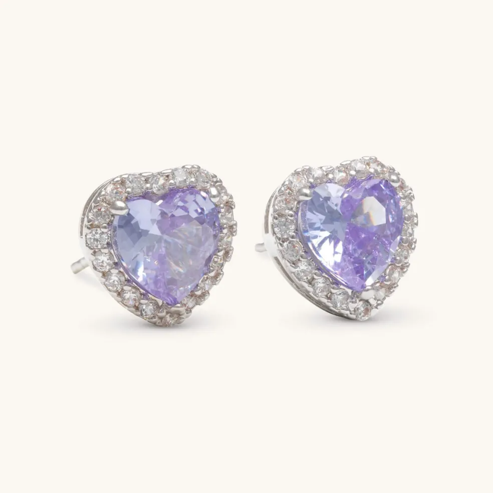 Delphine är ett par hjärtformade örhängen i vacker silverfärg som pryds av eleganta hjärtan med en lavendelfärgad kristall i centrum, omsorgsfullt inramad av små klara kristaller.