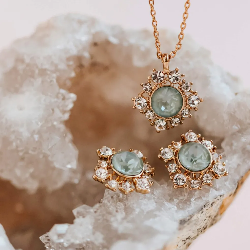 Upptäck de förtrollande örhängena från Lily & Rose, där designen lyfter fram en fantastisk agavefärgad pärla som huvudattraktion. Agavepärlan är omgiven av en underbar samling mindre klara silver och agavekristaller. Kombinationen av dessa gnistrande stenar skapar en harmonisk och bländande effekt som fångar och reflekterar ljuset på ett magiskt sätt.