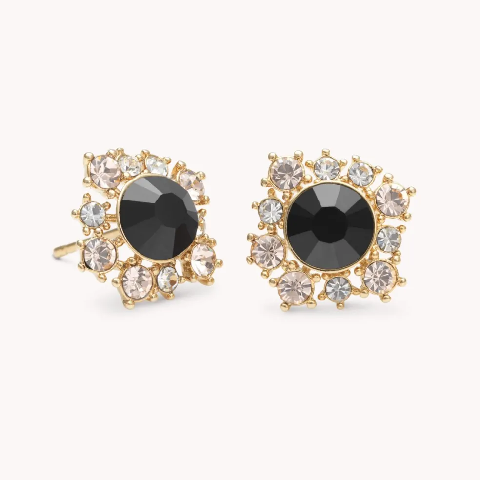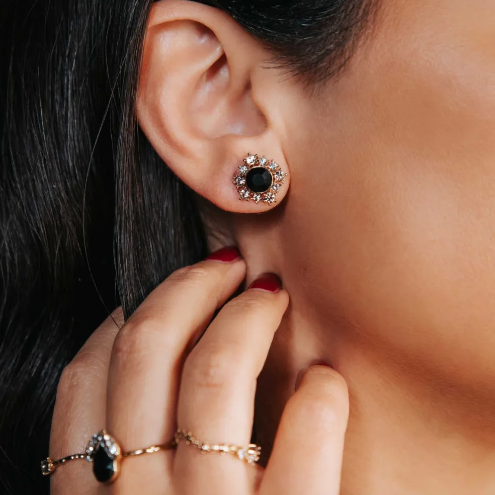 Varje örhänge har en imponerande kolsvart sten som utgör en dramatisk och elegant mittpunkt. Den djupa svarta färgen på stenen ger en mystisk och förförisk känsla, som drar blickarna till sig med sin intensitet.