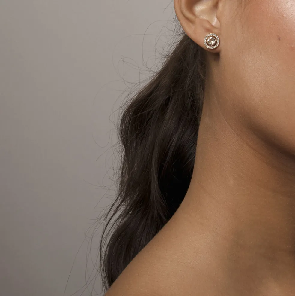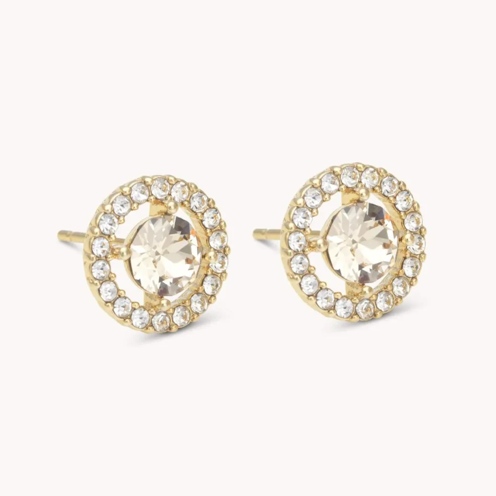 Varumärket Lily and Rose presenterar här ett par tidlösa örhängen i guldplätering. Dessa örhängen är prydda med små klara stenar och en stor kristall i delikat champagneton, perfekt balanserat på en glänsande guldbasen.