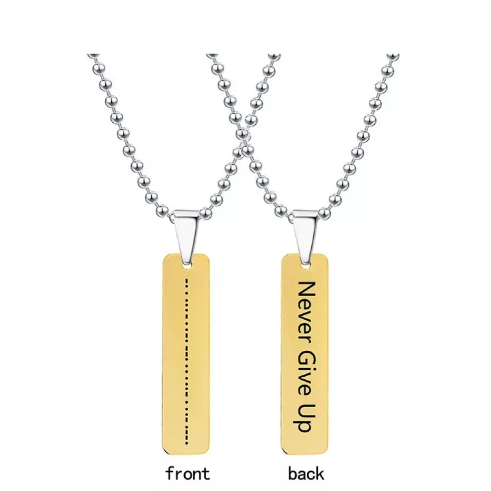 Halsband med budskapet Never Give Up i text på ena sidan och i punktskrift på andra sidan, kedjan tillverkad i stål och hänget i guldpläterat stål.