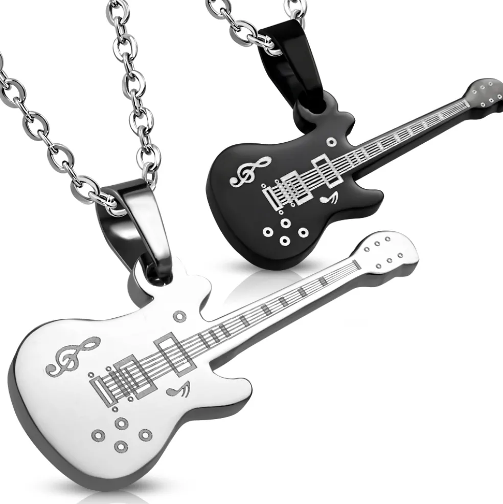 Ett parsmycke i rostfritt stål med två gitarrer inklusive två halskedjor.