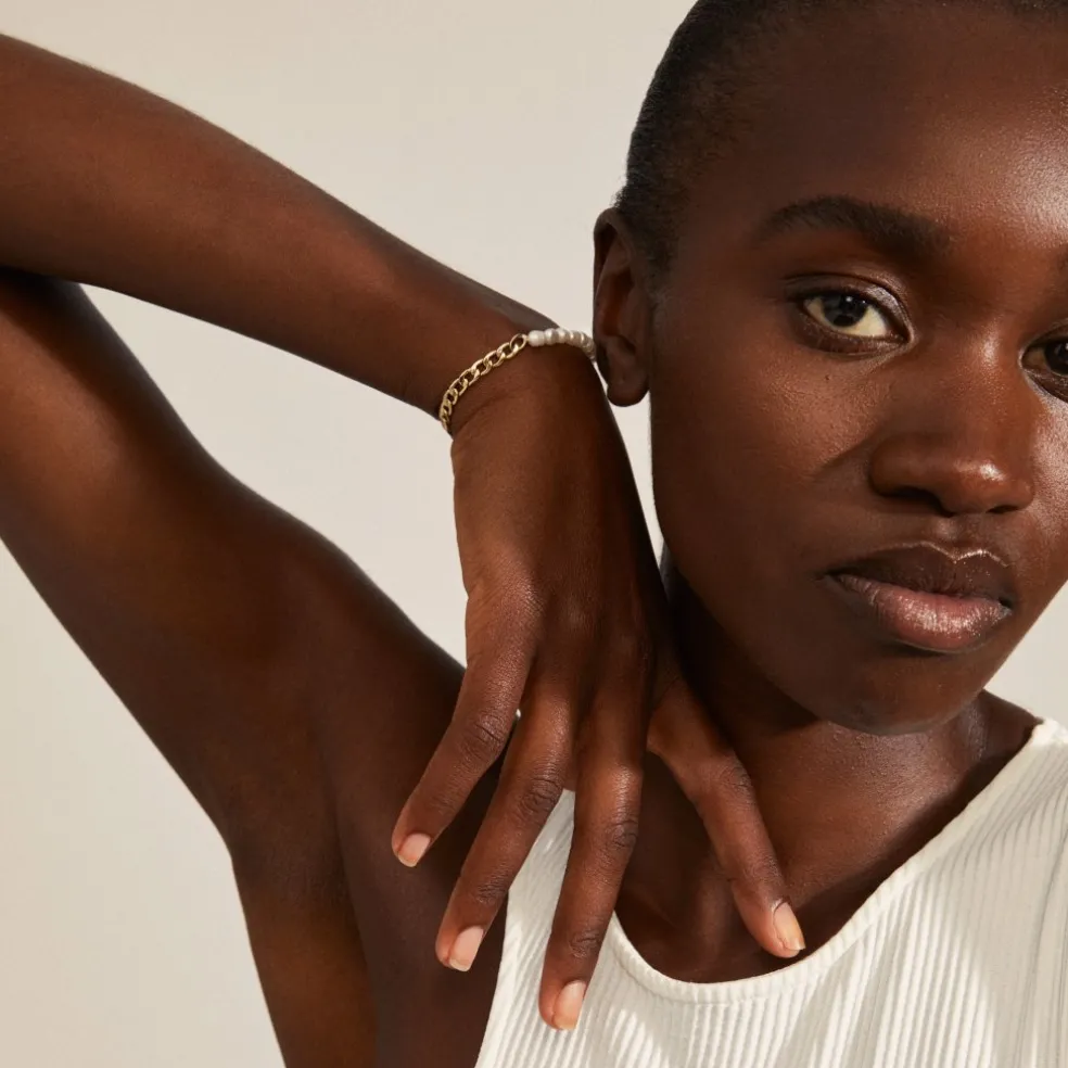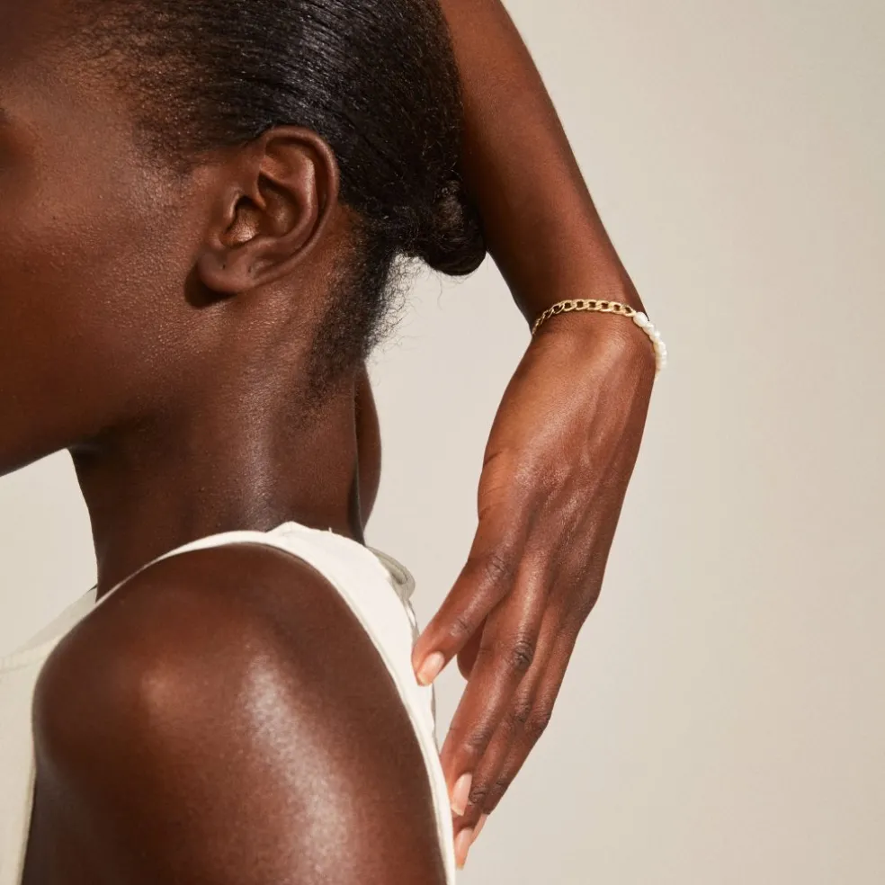 Det guldpläterade armbandet strålar med vackra vita sötvattenspärlor och ger eleganta och feminina vibbar. Ett klassiskt smycke som kan ge din styling en sofistikerad finish.