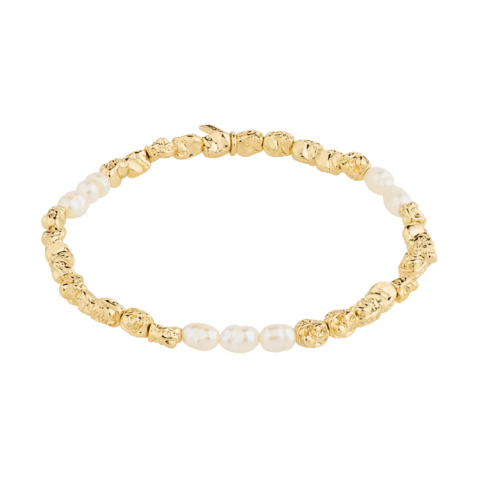 Elastiskt armband med guldpläterade pärlor kombinerat med en lekfull blandning av äkta sötvattenspärlor. Armbandet är tillverkat med ett slitstarkt elastiskt band i lycra och passar de flesta handleder.